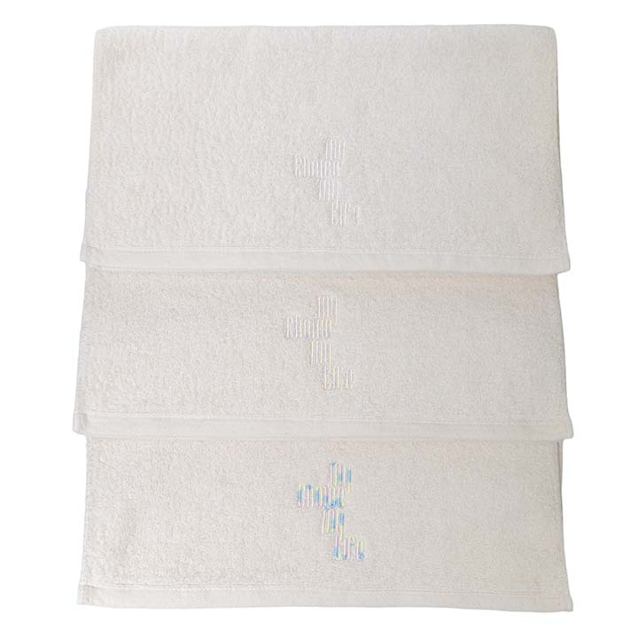 無染色のオーガニックコットンのアイボリーに、さりげなく「MY CHOICE MY LIFE」と刺繍されています。