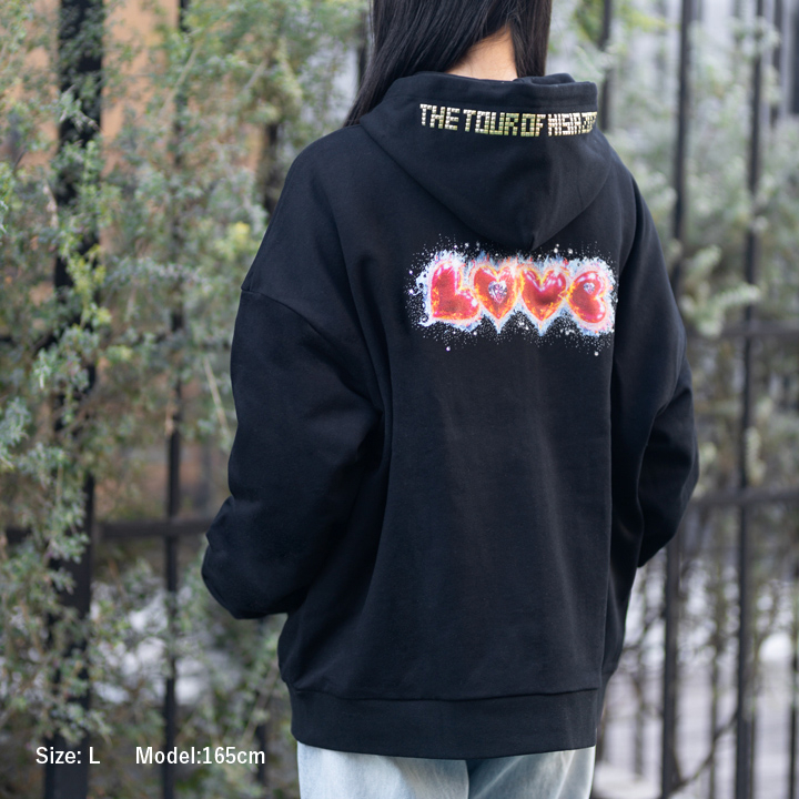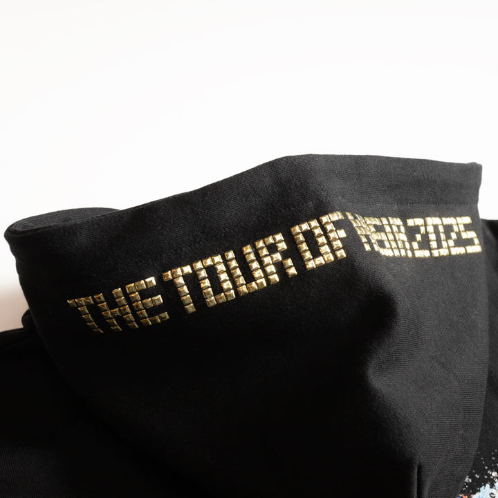 胸元とフードにはツアー名を施したスタッズ、背中にはラメ加工とラインストーンで飾られた「LOVE」のロゴが光り輝きます。