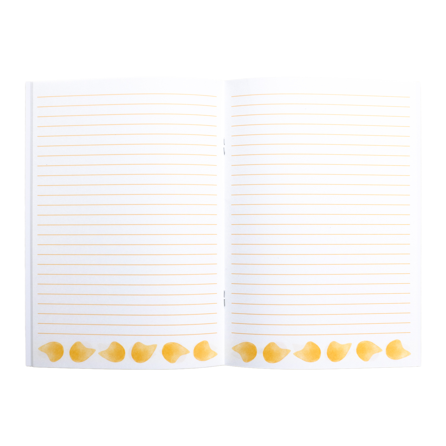 ノートの中身は、日常使いに適したシンプルな罫線とポテトチップスのイラストが描かれています。サイズはA5(約148mm × 210mm)で、持ち運びにも便利です。